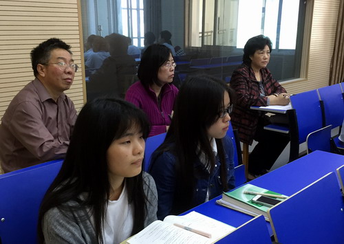 吴副校长认真、专注地听课,做了详细的听课记录,并在课后与邱望华老师进行了交流,肯定了邱老师良好的教学效果,授课内容层次分明,希望在以后上课时节奏慢点给学生留点思考时间。