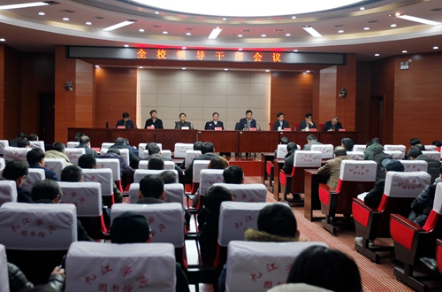 1月14日,学校在逸夫图书馆报告厅召开期末中层干部会议。党委书记赵伟出席会议,校长刘晓东部署期末工作,党委副书记魏立平主持会议。校领导王万山、陈春生、杨耀防、李广欣、陈小林,党委委员王殿元、冯健及全校副处以上领导干部参加了会议。