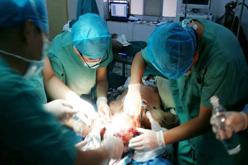 该患者系一位货车司机,车祸发生后不慎坠入生石灰中,当即感觉头部和左前臂的裂伤处疼痛难忍,由急诊120送入临床医学院/附属医院神经外科救治。入院时该患者神志不清晰,双侧瞳孔无法观察,头皮及左前臂肘关节处大面积皮肤伤蚀、缺损,发黑,其他多处皮肤化学烧伤,全身多处软组织挫伤。经医务科但传军主任支持帮助,神经外科赵浪平主任统筹,科室一边做好基本术前准备,一边迅速邀请临床医学院/附属医院骨科、眼科、耳鼻喉科、烧伤科专家联合会诊,各科专家同台在急诊全麻下进行了大面积清创+异物清除+VSD引流术,经过约5小时的努力,手术顺利完成。