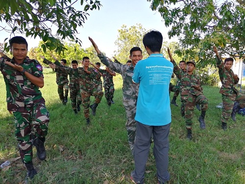 文武之道,一张一弛。在体验到汉字的魅力之后,学生们来到教室外的草坪上,跟随崔晨晨老师学习起中国传统礼节---作揖礼和抱拳礼,并一招一式地跟随崔晨晨老师操练起少林五步拳。少林五步拳,招招式式皆显示出中华武术的精气神韵,短短45分钟过去,学生们意犹未尽,纷纷表示还想继续学习五步拳。武道精神化为一股气,在911旅汉语中心的草坪上,凝聚成一座别样的中柬文化交流之桥。