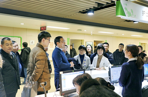 下午,殷小平一行前往邵医下沙院区参观。在该院引导人员的带领下,大家深入医院各部门、各区域,对医院规划与布局、现代化医院管理理念的落地、医疗护理质量管理与控制、科研项目管理措施、后勤服务社会化管理、信息化建设等内容进行了实地考察。