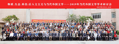 由《当代外国文学》编辑部、广东外语外贸大学主办,广东外语外贸大学英语语言文化学院承办的2019年当代外国文学学术研讨会于2019年3月22-24日在广东外语外贸大学北校区召开。研讨会聚焦后人文主义语境下的当代外国文学,来自全国各地的288名代表探讨了当代外国文学中的物质、生态、科技等议题。除了精彩纷呈的主题发言,大会针对当代外国文学研究中的热点问题,还开设了“国际科幻文学现状与未来发展”、“当代外国文学研究中的认知转向”、“文学中的物转向与陶瓷的故事”以及“现代声音:人类、机械与其他”等4场专题论坛,以及族裔文学、性别文学、,幻想文学、哥特文学及自然文学等12场小组讨论。我校外国语学院副院长周志高教授应邀参加了此次会议并在会议上发言。