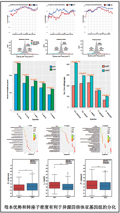 团队首次系统解析了多次独立多倍体化异源四倍体鲤科鱼类亚基因组的起源和提出了亚基因组不对称进化的普遍规律;首次在动物中发现来源于母本的亚基因组显著富集免疫相关的串联重复基因,揭示了母本亚基因组在多倍体鲤科鱼类适应外界环境中起重要作用。上述研究结果对阐明亲本基因组融合后的不对称进化规律、多倍体物种的形成、基因组变异模式及其对性状形成的影响等具有重大意义。