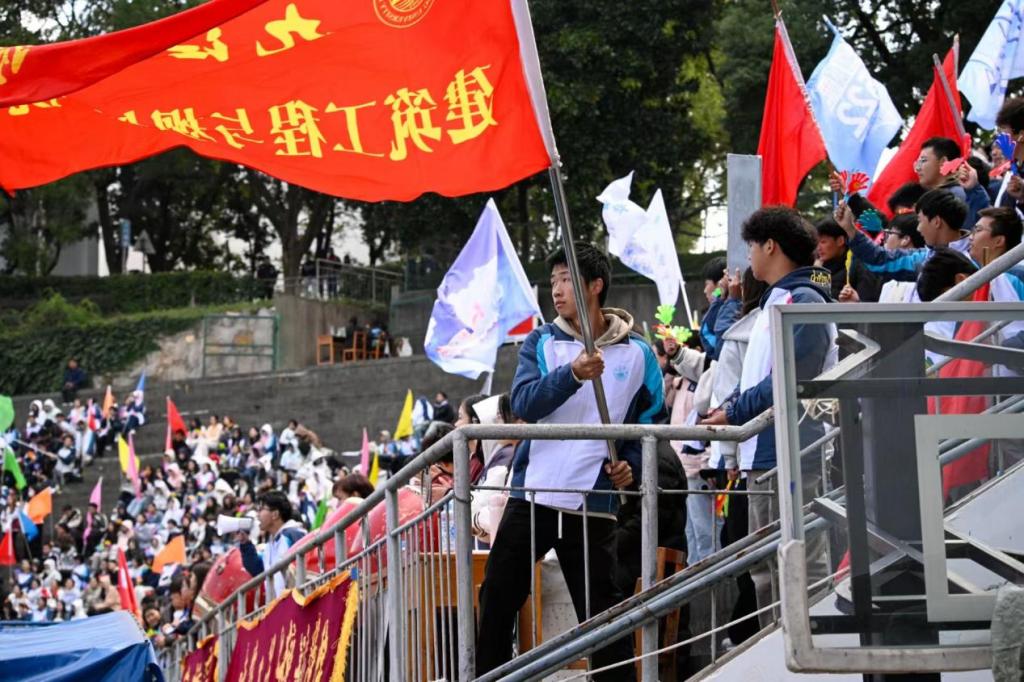 “加油!”“坚持住!”看台上,呐喊声此起彼伏;锣鼓声阵阵,点燃全场热情。各学院拉起定制横幅,啦啦队挥舞院旗,同学们踮脚眺望赛道,纵使秋风习习,也吹不散大家的观赛热情。