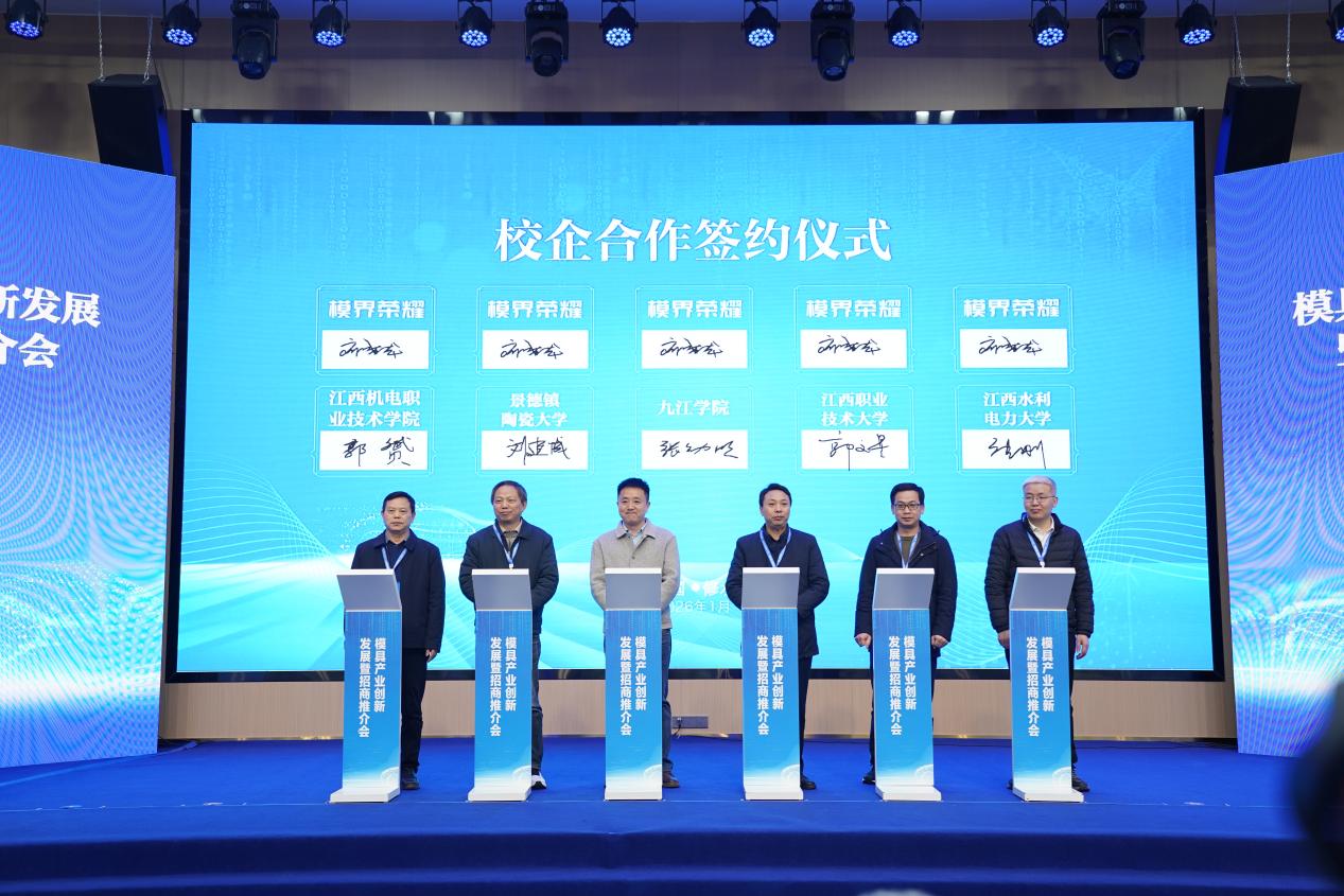 现场签约仪式由九江市政府副市长、经开区党工委书记陈水连主持。九江学院、江西水利电力大学、景德镇陶瓷大学、江西职业技术大学、江西机电职业技术学院代表上台与模界荣耀科技有限公司签订了战略协议。