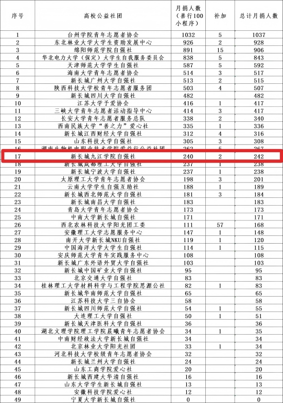 近日,2025年中国乡村发展基金会“善行100”月捐行动表彰大会圆满落幕。我校学生工作处(学生资助管理中心)指导的新长城九江学院自强社凭借突出的组织动员能力与扎实的公益实践,在全国高校公益社团中荣获全国第17名的优异成绩,充分展现了九江学院青年学子的责任担当与奉献精神。