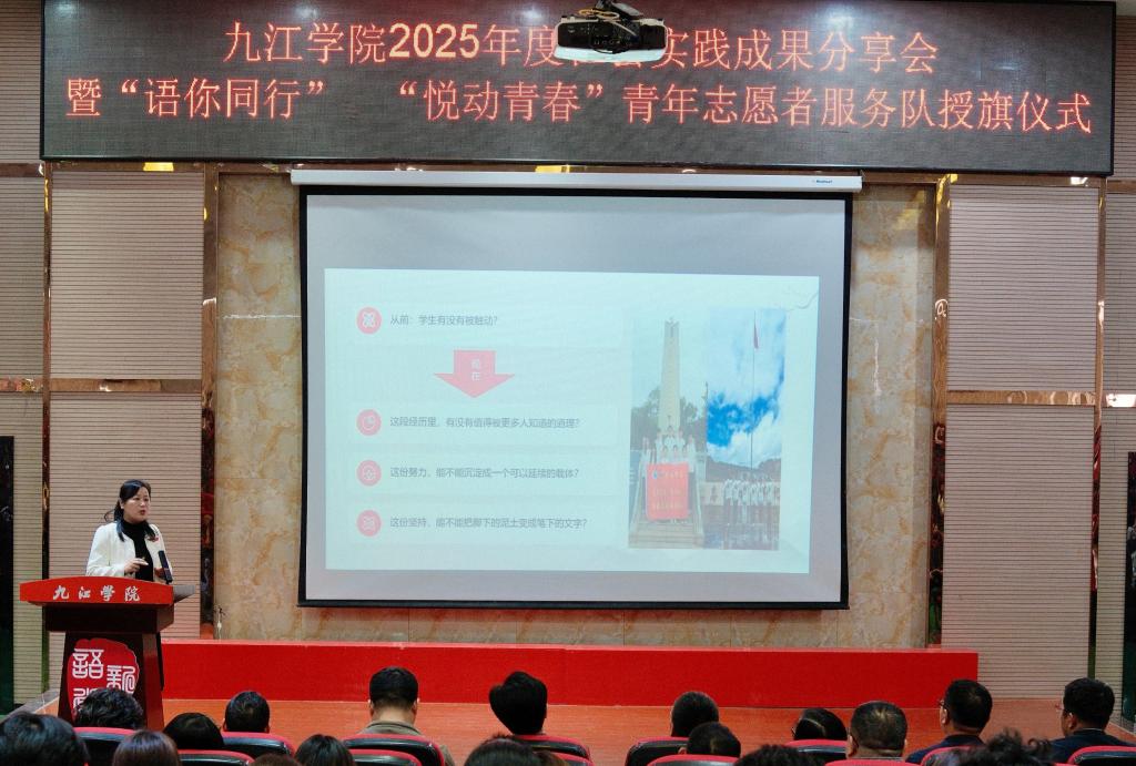 4月15日下午,九江学院2025年度社会实践成果分享会暨“语你同行”“悦动青春”青年志愿者服务队授旗仪式圆满举行。校党委委员、副校长吴维勇出席并讲话,校团委主要负责同志,党委宣传部、教务处相关负责同志,各二级学院党委副书记、团委书记、社会实践指导教师代表、实践团队代表、志愿者代表等300余人参会。