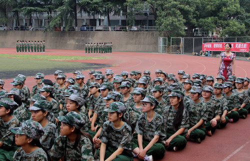 操场上,同学们在教官和助理班主任的指导下,认真完成每一个军姿,立正、稍息、原地踏步……。看似非常简单的动作,但是要达到全连整齐划一,也是非常不易的。在太阳照射下,不一会儿,同学们的汗就浸透了军服。有的同学很不适应,很快就报告,需要休息。