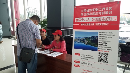 为了展示江西庐山美景,帮助游客更好的了解庐山,江西旅游发展委员会联合江西五套一起举办了“喜迎十九大,江西风景独好”活动”,艺术学院青年志愿者服务队的志愿者们利用自己的假期时间积极参加活动,用自己的行动来服务社会。