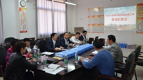 10月26日下午,校思政工作督察小组会计学院党委书记吴玲、艺术学院党委副书记沈杨一行来到经济与管理学院开展思政工作督查,听取了经管学院思政工作专题汇报。经管学院党政班子成员及其他相关负责人参加了本次会议。