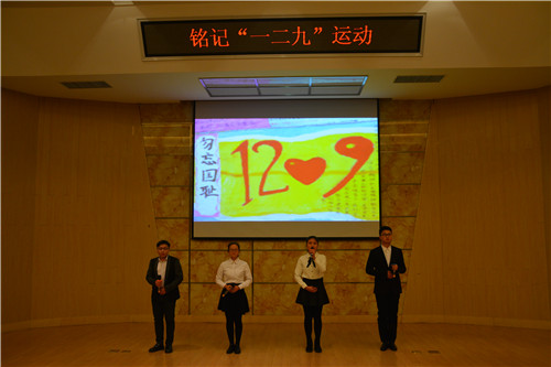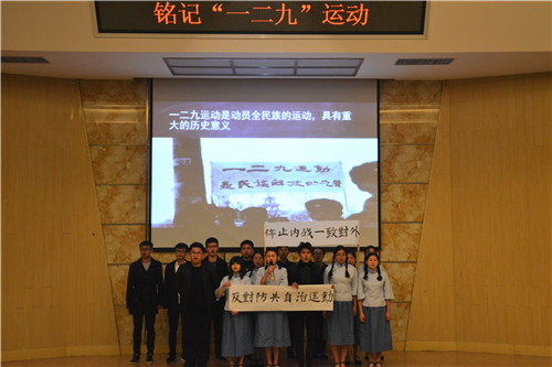 活动伊始,主持人阐述了举办“一二九”纪念活动的意义,历史学社社员黎志如通过PPT的形式为同学们讲解了“一二九”运动的历史背景及相关内容。随后,现场情景剧及一幕幕影片的展现,让同学们回顾了历史,深刻地体验当时爱国青年的满腔热血。诗歌朗诵和大合唱《中国军魂》更是将现场气氛推向高潮,同学们用朗读声和歌声表达着对革命先烈的崇高敬意。期间,主持人通过有奖问答的方式,让同学们进一步积累了相关历史知识。最后,刘华平老师为作了总结。他指出,当代大学生应该铭记历史,深刻地认识到“一二九”运动的伟大意义,做到“记耻不记仇”。老师还希望同学们能在今后的学习生活中“把握今天、认清形势,知识报国、开创未来”,从而完成“奋发有为、成人成才”的美好愿景。