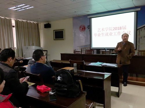 3月14日下午,艺术学院2018届毕业生就业工作会在教学楼东102召开。院长吴维勇、党委书记王春生、学校招就处刘明老师、艺术学院负责就业工作的老师、毕业班辅导员及班主任出席了会议。会议由党委副书记沈杨主持。