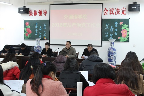 3月21日下午,外国语学院在香远楼315室召开从严治党工作会议,学院领导,副科以上,教研室正副主任,党支部书记参加,会议由院长韩琨主持。