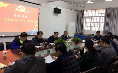 为深入学习贯彻全国“两会”精神,4月4日上午,基础医学院在华105会议室召开党委中心组扩大学习会。基础医学院党委全体成员、学院各部门负责人、各教研室负责人、各支部书记参加了学习会。会议由党委书记余朝阳同志主持。