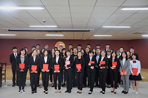 刘梦老师向在座同学宣布新一届学生会成员名单,2017届学生会主席黄睿代表离任学生干部发言,总结了在学生会三年工作的收获并告诫新成员务必具备责任感、拥有集体意识并端正工作态度。2018届学生会主席黄慧倩代表新一届学生会干部发言。她表示将接过手中的接力棒,发挥新一届学生会的积极性、主动性,承诺将通过落实章程来进一步规划管理学生会组织,并带领学生干部们现场学习《关于发起<学生会、研究生会干部自律公约>的倡议》。